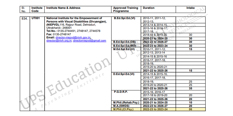 The National Institute for the Empowerment of Persons with Visual Disabilities (Divyangjan) is also known as National Institute for the Visually Handicapped (NIVH) and it is based in Dehradun, Uttarakhand. It operates under the Ministry of Social Justice and Empowerment, which is supervised by the Indian government’s Department of Empowerment of Persons with Disabilities. NIEPVD conducts various workshops, events, and courses under the Special Educational Programmes. The details for the RCI License are as follows.