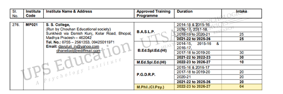 The S.S. College is based in Bhopal, Madhya Pradesh and it operates under the Chouhan Education Society with experience of over 22 years in conducting various educational Institutions. It includes medical, engineering, pharmacy, and other courses as well as Special Education Programmes. Some of the courses in which are BASLP (Bachelor’s Degree in Audiology & Speech Language Pathology), B.Ed. Spl.Edu (HI) (Bachelor in Special Education for Hearing Impairment) and PGDRP (Post Graduate Diploma in Rehabilitation Psychology). Now it includes an M.Phil Clinical Psychology course as well, details on the same are as follows.